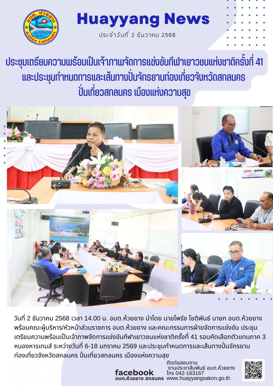 วันที่ 2 ธันวาคม 2568 เวลา 14.00 น. อบต.ห้วยยาง นำโดย นายไพรัช โชติพันธ์ นายก อบต.ห้วยยาง พร้อมคณะผู้บริหาร/หัวหน้าส่วนราชการ อบต.ห้วยยาง และคณะกรรมการฝ่ายจัดการแข่งขัน... [2 ธันวาคม 2568]