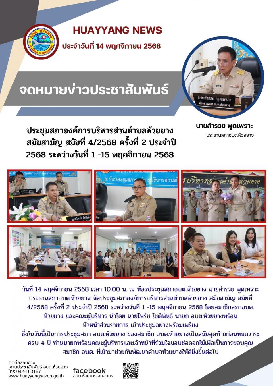 ประชุมสภาองค์การบริหารส่วนตำบลห้วยยาง สมัยสามัญ สมัยที่ 4/2568 ครั้งที่ 2 ประจำปี 2568 ระหว่างวันที่ 1 -15 พฤศจิกายน 2568 [14 พฤศจิกายน 2568]