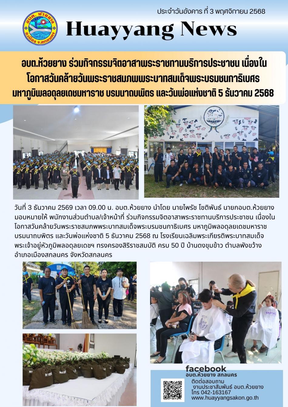 อบต.ห้วยยางร่วมกิจกรรมจิตอาสาพระราชทานบริการประชาชน เนื่องในโอกาสวันคล้ายวันพระราชสมภพพระบาทสมเด็จพระบรมชนกาธิเบศร มหาภูมิพลอดุลยเดชมหาราช บรมนาถบพิตร และวันพ่อแห่งชาติ 5 ธันวาคม 2568 [3 ธันวาคม 2568]