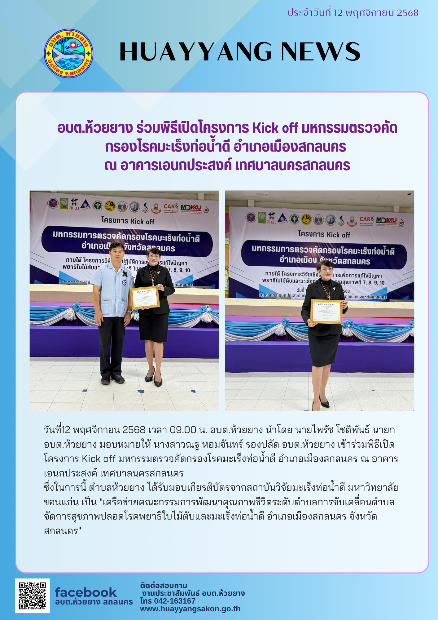 อบต.ห้วยยาง เข้าร่วมพิธีเปิดโครงการ Kick off มหกรรมตรวจคัดกรองโรคมะเร็งท่อน้ำดี อำเภอเมืองสกลนคร [12 พฤศจิกายน 2568]